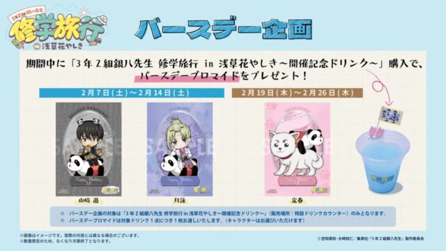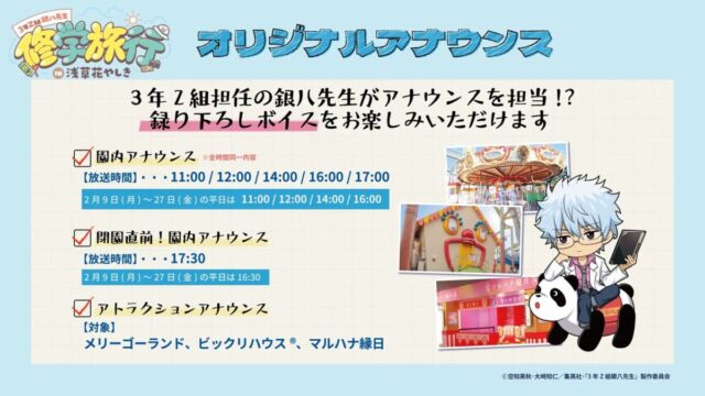 TVアニメ「3年Z組銀八先生」と浅草花やしきによるコラボレーションイベントが開催されます。本イベントでは、坂田銀八先生と生徒たちが修学旅行で花やしきを訪れたイメージの描き下ろしイラストを使用した展示や、オリジナルグッズ、コラボフード、ラリー企画などが実施されます。イベント期間中は、新規収録された坂田銀八によるオリジナルアナウンスも楽しめます。